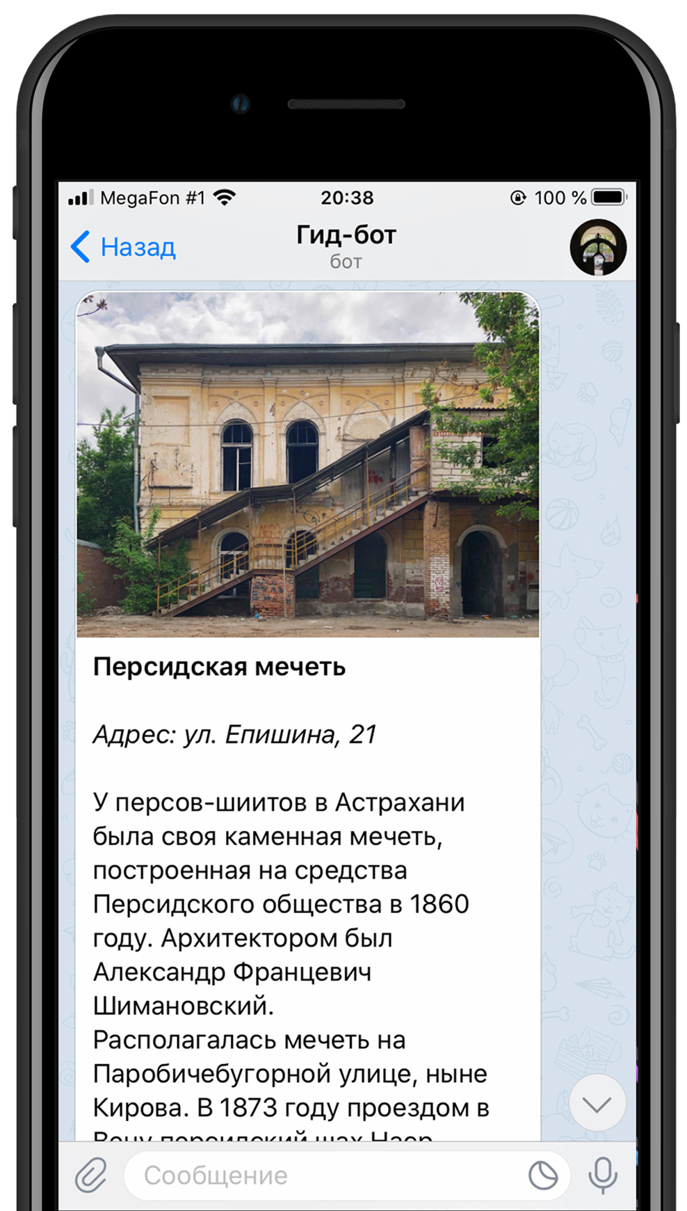 Гид-бот - удобный городской гид. В нем собраны бесплатные маршруты от жителей и платные от краеведов и гидов России. Гуляйте, когда вам удобно. Ставьте на паузу и возвращайтесь к маршруту в любое время. Каждый шаг на маршруте сопровождается гео-точкой и описанием с историческими фактами. Вам не надо переключаться между множеством приложений. Все собрано в одном и удобном гид-боте.